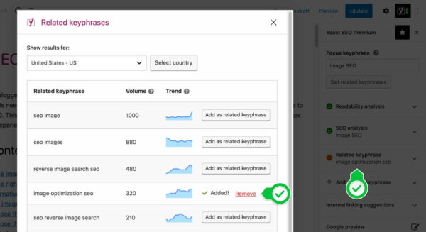 This feature is available for free, but if you have Yoast SEO Premium you have the benefit of using it in the related keyphrase feature. This feature allows you to add related keyphrases to a related keyphrase field in the Yoast SEO sidebar or meta box. This helps you optimize your content for multiple keyphrases and synonyms. If you want to know more on this integration, we have an article on how to use the SEMrush related keyphrase feature.